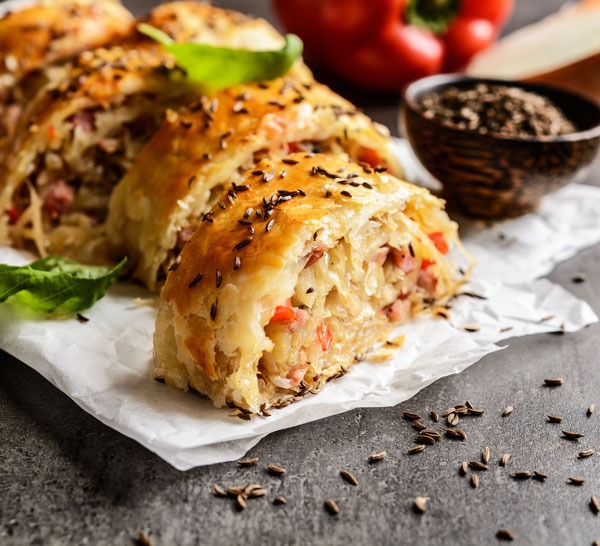Feuilleté de chou blanc lactofermenté aux poivrons rouges et aux lardons
